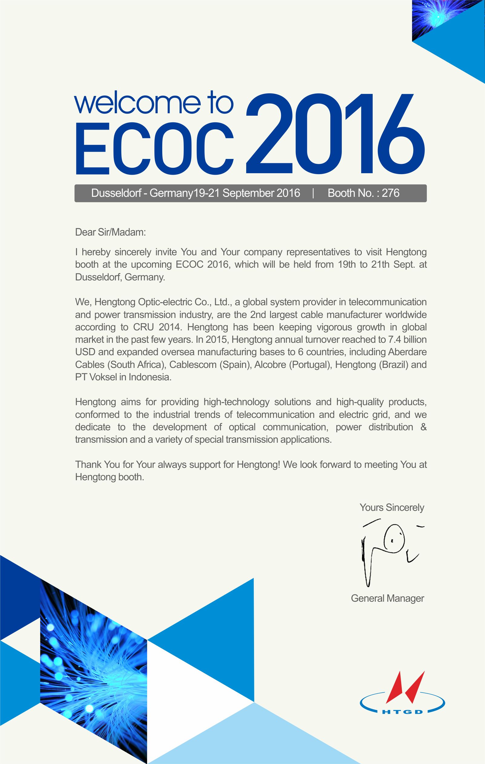 Hengtong was invited to ECOC on September 19th 2016, and the exhibition will end at September 21st. Hengtong Optic-Electric is committed to providing customers with Smart Grid, Power System and Communication Network Construction solutions, enhancing completely technological content of products and helping customers in achieving more values.